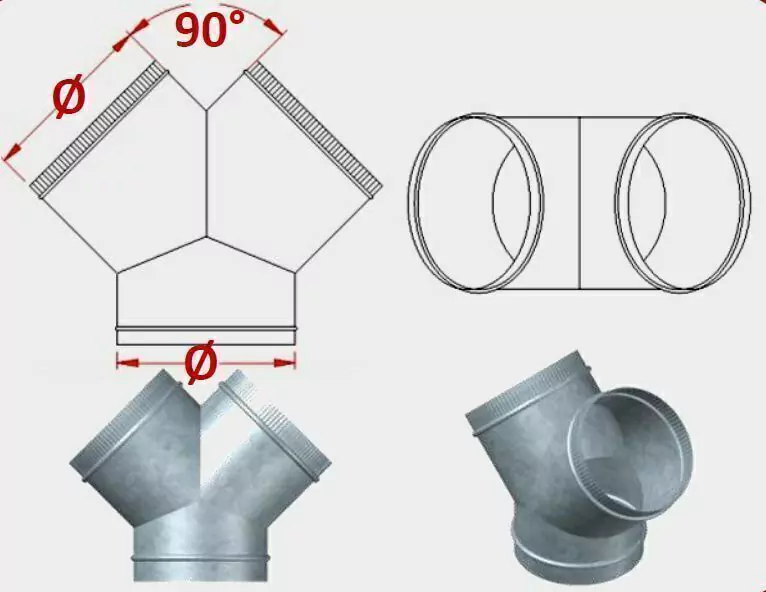 Conexión para espiroducto tipo Y Griega con salidas a 45°, fabricada con lamina galvanizada en diámetro Ø de 4” hasta 60”, en calibre de 20 a 26 dependiendo las dimensiones de la pieza, el diámetro de sus tres bocas es igual. También fabricados en acero inoxidable y lamina negra.
